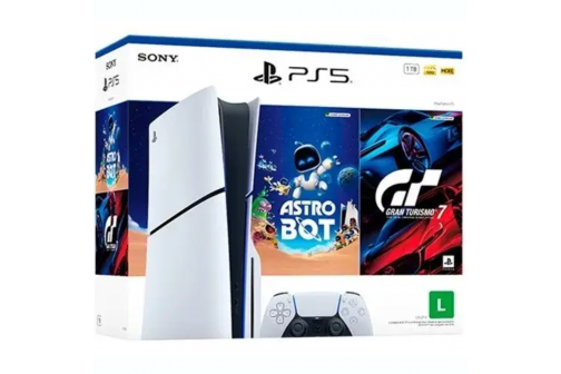 O PS5 Slim com leitor de disco e os jogos Astro Bot e Gran Turismo 7
